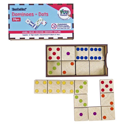 21pc Domino dots with coloured dots. One to six dots. Wooden dominoes size 60mm x 30mm 3mm in wooden box.