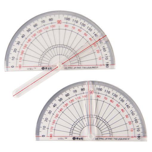 Protractors are measurement tools for math. This set contains 2x180-degree protractors that can be used to measure angles. Protractors can also be used to draw and identify angles. The protractors are transparent to make it possible for children to see the angles they are measuring through the protractor. Every 10 degrees is marked with long lines and numbers, while the other degrees are marked with short lines. There are two rows of degrees, so children can measure in more than one direction. The degrees in one row are written in black, while the degrees in the second row are written in red.