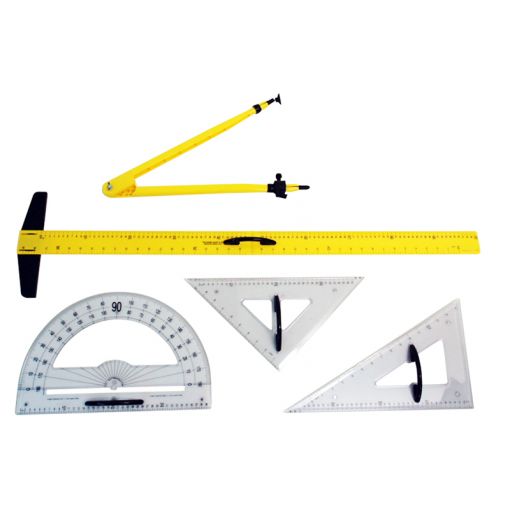 A transparent Math set (also called geometric tools) that includes a ruler, 2 triangles (also called set squares), 1 protractor and 1 compass. Children can use these tools to draw geometric shapes as well as measure length and angles. Rulers are used to draw straight lines and measure length. A compass is used to draw circles, arcs and angles. Protractors measure angles. Triangles can be used to draw angles and lines. In this math set, the ruler, protractor and triangles have handles.