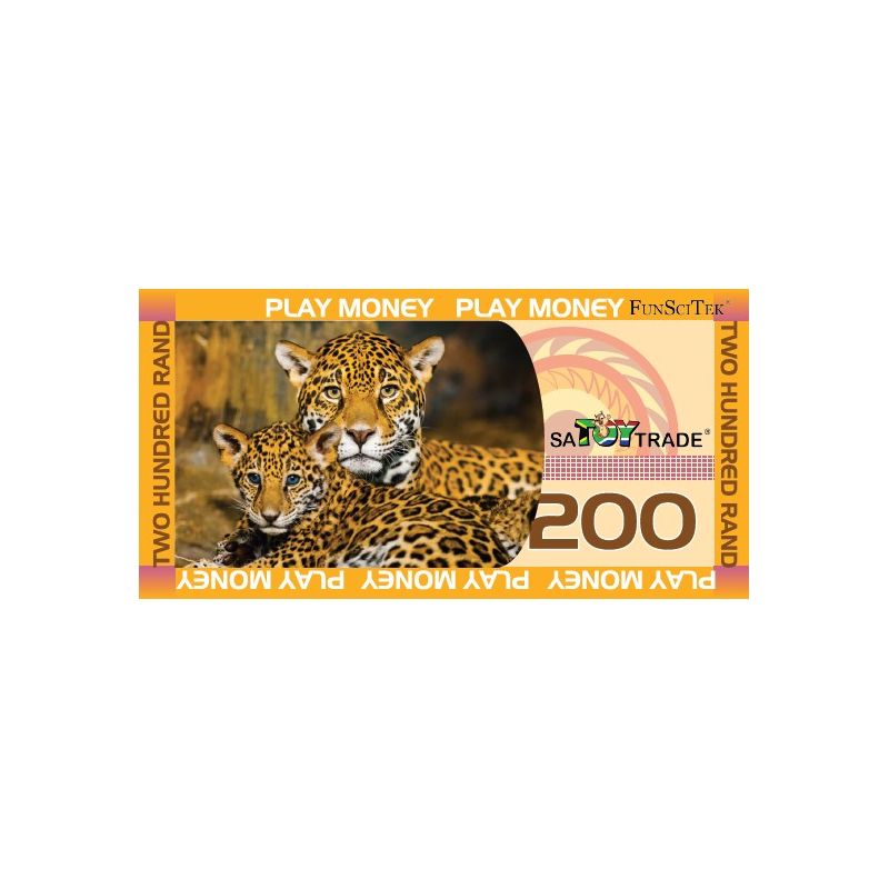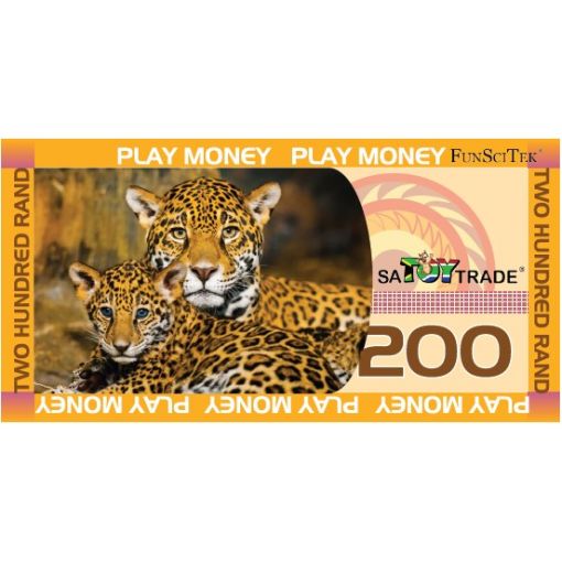 South African play money set. SA play money sets includes: 4x each of the Coins 10c, 20c, 50c, R1, R2 and R5. 8x each of the notes R10, R20, R50, R100 and R200 and one Credit Card.