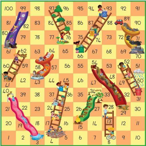FunSciTek® Slides & Ladders – Jumbo PVC Mat (1×1 m) is a large, colourful floor game designed for group play and active learning. The mat features a 1–100 grid with bright illustrations promoting a healthy environment, such as recycling, planting trees, and sa