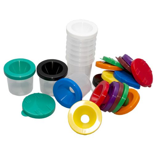 Any age. Clear paint pots with coloured lids (10pc). Can be used to store paint and other art materials. Paint is not included.